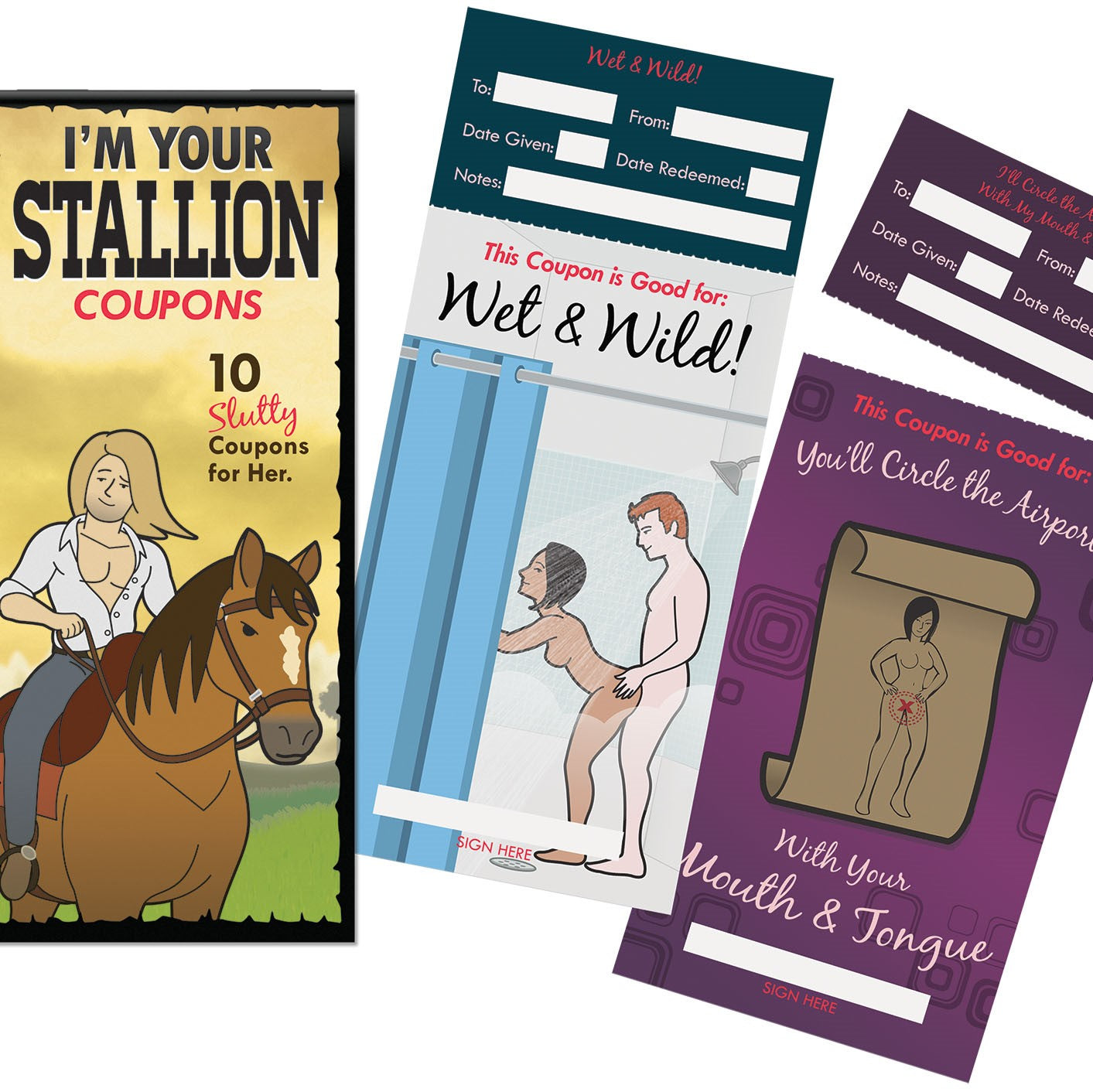 10 Slutty Coupons for her to enjoy. She gets to present coupons to him when she wants to redeem one of the humorous, yet sexually satisfying, coupons. Examples include, âA Cunning Linguistâ and âItâs a Heavy Snow Day⊠Time For Some Deep Plowingâ Includes: 10 Hilarious and Sexy Coupons