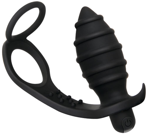 The Rechargeable Anal Cock Ring and Anal Vibe is a unique men's toy that cradles the penis and balls with two separate rings, while an attached vibrating butt plug works its stimulating magic!
